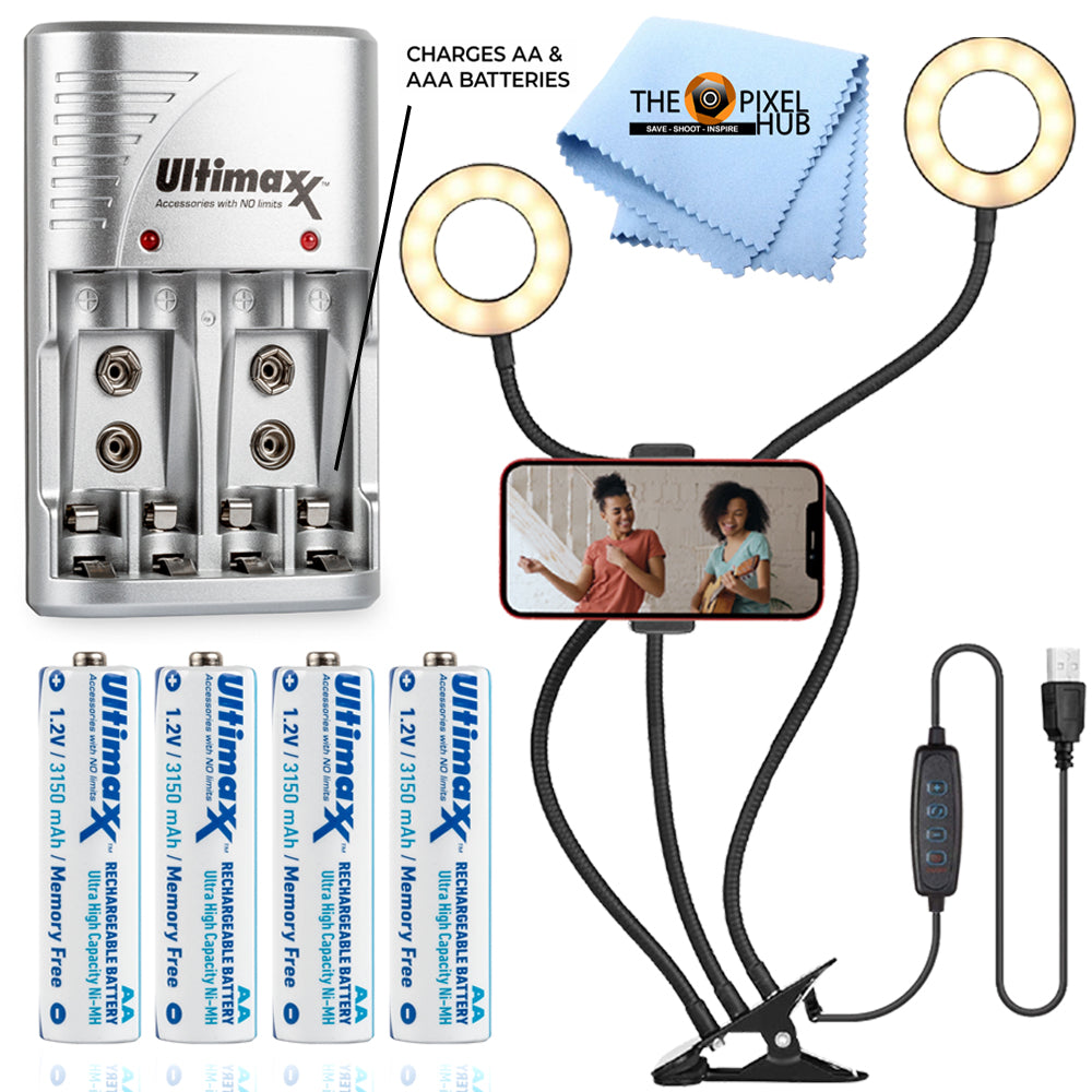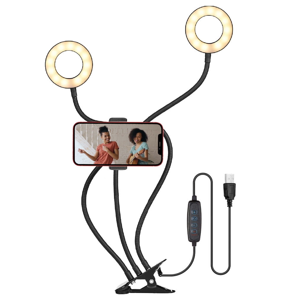 Bluestone USB Double Anneau Lumineux avec Support de Téléphone + Kit de Vlogging Piles AA