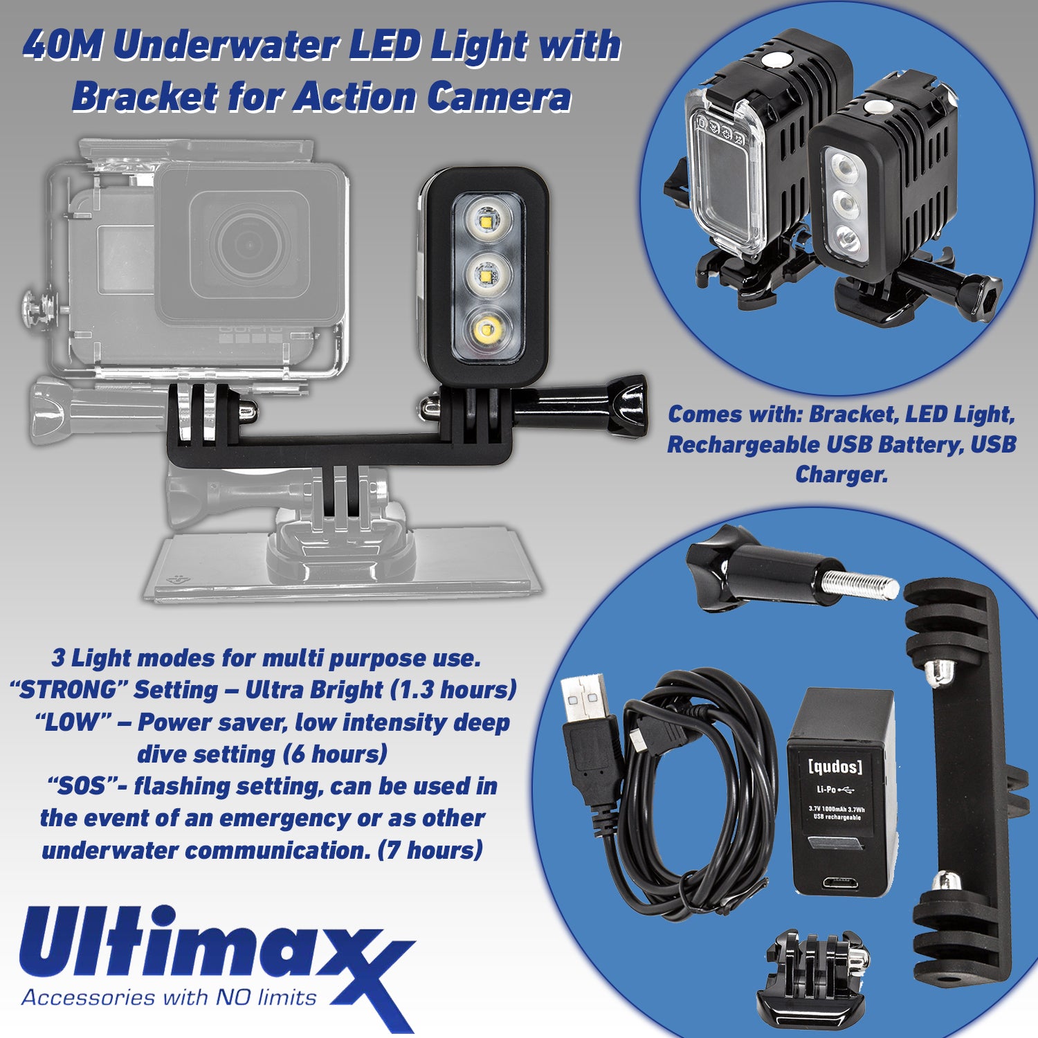 La base de batterie est dotée de contacts électroniques qui connectent deux modules pour qu'ils fonctionnent ensemble comme un seul. Un cadre de montage à dégagement rapide avec une housse coupe-vent et une conception dissipant la chaleur est également inclus. Le système ONE RS est conçu pour être étanche et peut être utilisé sous l'eau jusqu'à 16'.