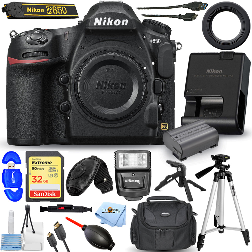 Nikon D850 DSLR Camera (Body Only) 1585 32GB + Flash + Tripods Pro Bundle